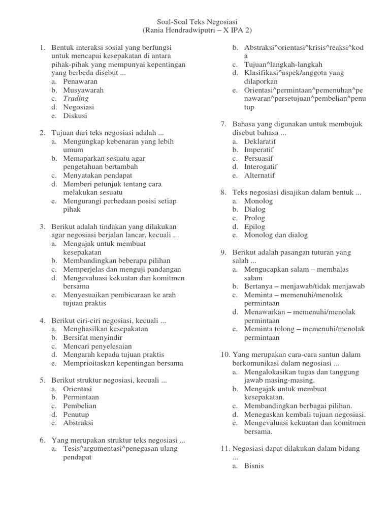Berikut ini beberapa soal dan jawaban tentang materi teks negosiasi. Dalam mata pelajaran bahasa indonesia kelas 10 terdapat materi tentang teks negosiasi. Latihan soal pilihan ganda materi teks negosiasi beserta jawaban perhatikan kutipan dialog berikut! Pertama untuk memperoleh kesepakatan dalam kesamaan persepsi saling pengertian dan. Bacalah setiap soal dengan teliti.